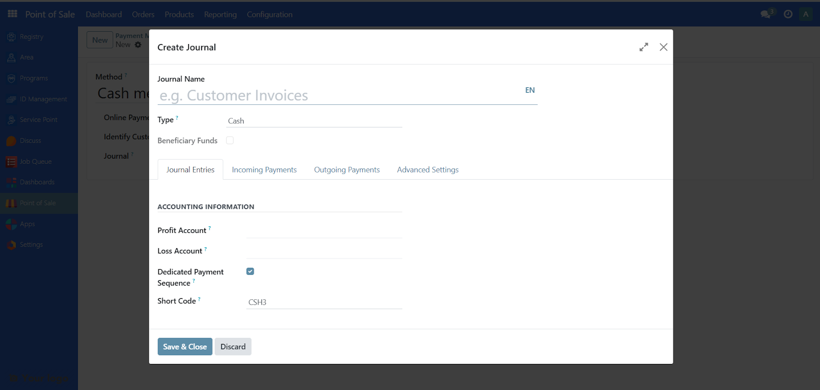Please Note: For Cash payment method a unique payment method needs to be created for each Point of sale. In order to create a new Cash Payment method, navigate to Point of Sale, click on Configuration and select Payment methods, then click New.